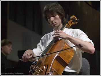 Christian Elliott, pictured here, playing his own composition for cello and piano in three movements entitled "Modern Prometheus" is one of thirty composers under thirty years of age whose work is being showcased today at the Chamberfest. Christian is twenty. Intense, well structured, and listenable, the piece is about the dangers of going against the natural environment.