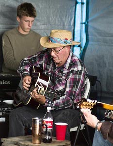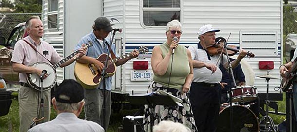 Fiddle Park is an empty field on the edge of town that becomes a village of 850 campsites during Fiddle week. But it is no ordinary campground. Its a great place to listen to music on Friday or Saturday night or after the parade on Saturday. A good number of the campers are musicians, some of whom come every year to play for people in the park. They dont do it for the money, no one hires them or invites them to play. Some may have a few CDs for sale, most do not. They might be family groups, amateurs or professionals. They play for the people and for the love of it. Some walk around with their instruments looking for a group to sit in with, so the group you stopped to listen to will grow and change as players come and go.