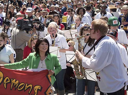 Under the guidance of a hockey-stick wielding conductor, the sound of hundreds of altos, sopranos, tenors and baritones filled the air. It was pure joy. Notable in the cheering section were: Jazz FM's Jaymz Bee and NDP candidate Olivia Chow.