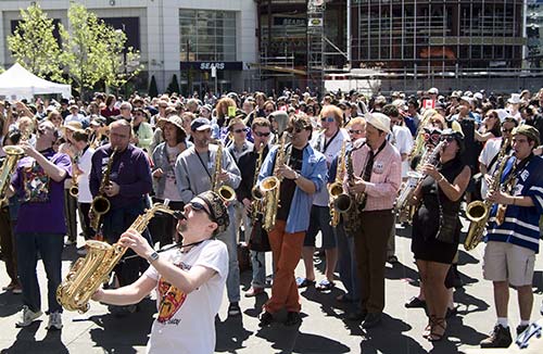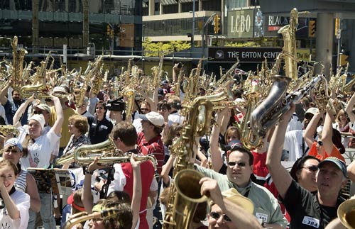 On Sunday May 30th, in downtown Toronto, 930 men, women and children brought their saxophones to Dundas Square and played the "Hockey Night in Canada" theme song.