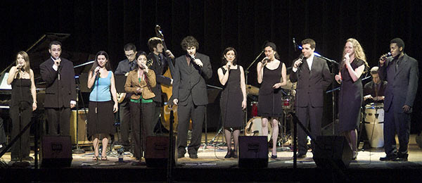 One highlight was Jordan Venn's vocal rendition of Kurt Elling's "Night Dreamer." Rapid automatic pistol bursts of word clusters, in registers from low to falsetto, breath defying meters and rhythms, delivered right on target, right on time. Impressive. Other numbers in the Mainstream Jazz Workshop set list included very difficult compositions by Wayne Shorter, Jimmy Heath, Scott Lefaro, Bird and Diz.The ensemble's reed and brass section did nice unison work all through, and Will Loach managed some nice blue trumpet solos, while Darryl Orr's work on alto on "Stablemates" was very lyrical. Paul Van Dyk provided a strong throbbing bass support to this ensemble and to the Vocal Combo in the second half of the show, especially in Cheesehead. Richard Grossman played some very fast guitar on "Shaw 'Nuff." |