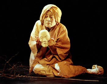 The curtain rises silently on a darkened stage. A faint spotlight reveals an old beggar woman bent over a thin walking stick in the rear of stage right. She fades from sight and reappears as if a cloud is passing through the moonlight. The crone moves towards centre stage at a pace slow and smooth as a moonwalk. Music moans like wind in a desolate place, broken by stark single notes of a koto.