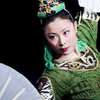 ...Her body swoops into dramatically held still poses, she is battle-ready in green silk trousers and green silk top...