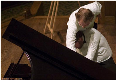 Comedy in a concentrated dose culminates in the traditional P.D.Q Bach concert concocted by Peter Schickele. One of his (P.D.Qs) titles should suffice to give you his parodic bent: Fuga Meshuga from The Musical Sacrifice, S. 50% off, Schlepped out of obscurity by Professor Peter Schikele. Let a photograph replace the thousand words needed to describe the whole event. Here are pianists Robert Cram and Paul Steward fighting for space on a single bench while performing Schickeles four-handed Sonata Piccolo.