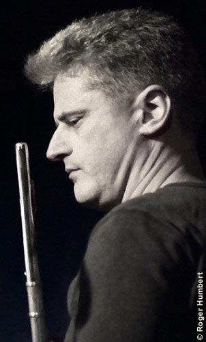 Jovino Santos Neto joined the Trio with his melodica, Doug Perry brought his viola, and the versatile reedman John Johnson brought his flute for a pair of tunes by the late Antonio Carlos Jobim: Dindi, and Desafinado. Flute and melodica took the pretty melody of Dindi through a long introduction, and the Gryphon began to weave a thick, rich tapestry of harmonies, providing the simple, lyrical mood of the melody with an astonishing emotional depth. Here is the key point of fusion--the in-the-world liveliness of the Latin and the beyond-this-world profundity of the Classical.