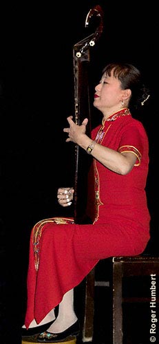 The two female players in the Silk Road Quartet on the stage of Hughs Room are dressed in Chinese silk dresses. The leader sits with a pipa upright in her lap. The pipa, is sort of a lute, with a pear-shaped belly, a very wide neck with a lot of metal frets despite its only four strings that are plucked or strummed by the thumb and finger picks on the player's digits. Picked or strummed, it sounds like a banjo, bouzouki or mandolin. When Qiu Xia begins picking the introduction to their first number, in honour of the Chinese New Year, the music sounds, well, Chinese. But when the rhythm section kicks in with André Thibault on guitar, Willy Miles on Bass Guitar and Feng Jun Wang on percussion, the sound is like, well, you want to let out a bronco-riding whoop Yeee-haaaa. |