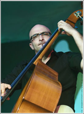 Attila Darvas, called in at the last moment to play with these giants, right after playing the opening gig with the wonderful Robi Botos Trio, took the pressure, kept the pace, and stayed the course. Not pictured here is Frank Botos, who also sat in with Trio and enjoyed looking good during the frequent short drum breaks the soloists gave him. Also not pictured here is the talented pianist Robi Botos, a hip Hungarian Gypsy with a huge heart, an effortless technique and barrels of juicy music in him that flow in a humorous way. His trio lives in Toronto, so not much can happen if you see their name on a local billing. If you go to hear them, theyll probably be there, and you wont be sorry. |