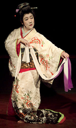 Hanayagi Hirokoma returned with a brief dance in which she alternated between wearing the full-face mask of a woman, and the mask of a bug-eyed and possibly tipsy man. We loved it. No interpretation was needed as she concluded this comical dance. Her pictures spoke volumes.