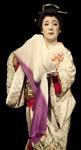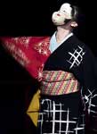 Ms. Hirokoma was clearly a traditional Japanese dancer because her makeup and wardrobe were in the traditional colour range: white face and hands, black dashes for eyebrows, red lips, and a helmet-like hairpiece of jet-black hair.