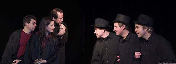 ); what are the names of the four houses at Hogwarts? (Blue, BrokenNose, SpongeBob, and?? Soiney??. ) Bumbledorf, played by Ralph MacLeod, gets the audience to answer these questions. Todays cast: Lauren Ash as Herheiny, Jane Luk as Prof. McMonocle, Kerry Griffin as Juan (aka Ron), Cary West as Mille Feuilles, Marcel St. Pierre as Hogrid, and the productions creator, Barry Wilson as Hairy, bravely improv out the instructions they are given.