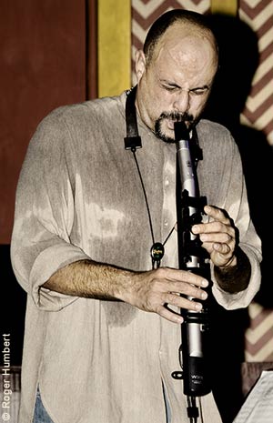 Angel starts the first piece on EWI. Everyone plays in different directions, while a heavy Latin rhythm fuses them. Dizzy-ing. The four sax registers sound together. Mingus meets Klezmer, organized chaos. Three saxes in a circle, interweaving rhythmic phrases, soprano soloing over it all. Percussion, drums, clave. Manteca!
