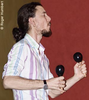 One more piece I must mention features drummer Francois playing a maracas solo. What a musical imagination and mastery a big word when were talking about maracas, but such it is of the instrument he shows. He starts out simple and builds his solo. He shakes the maracas, tight fisted, in front. Seemingly alive, one and sometimes both of them takes his hand out and up flight of the bumble bee. He reins them in sharply, creating more complex rhythms. He whistles. He shakes one horizontally, sweeping it across in front of his mouth like an electric toothbrush. He hits their wooden stems together sounding the clave, accompanied by maracas. He hums a melody. The rest of the band come back on stage and play punctuated playful jazz.