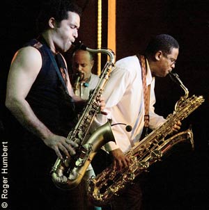 Another piece showcases the virtuosity of Jorge Almeida. It starts with Jorge alone on stage, notes tumbling forth from his soprano in a sort of classical-jazz, Bach-unleashed manner and ends with the entire band back on stage in raucous bebop ectasy. The atmosphere for an African piece is set up with the drummer and three of the sax players on a darkened stage, talking as they sit down with tiny identical hand drums. Each playing different parts, they move through complex rhythms, until Evaristo comes on stage and sings a cappella.The four others join in harmony, and fall silent, Evaristo again singing alone. The finale, reached in stages, sees them all singing, clapping rhythms and moving side to side while stamping their feet, using the stage as a bass drum.