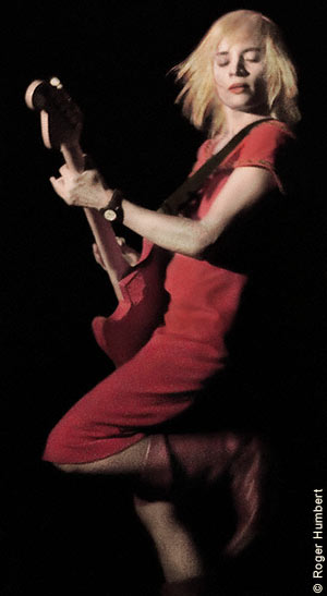 Priya Thomas, a young Canadian artist, opened for Cale. Alone and surrounded by the bristling array of erect guitars (all awaiting Cale and his musicians), this lithe blond Venus in red seemed lost and vulnerable. Priya quickly dispelled that impression. Playing a low-strapped Stratocaster and backed by a pedalfull of electronics, she moaned and shouted out her staccatto acid ballads, snapping her head, stomping her boots and shooting her pick hand towards the sky. Vivid.