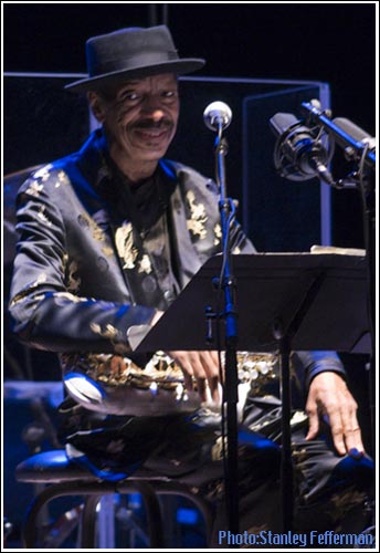 It's been decades since Ornette's been in Toronto, and after the initial standing ovation for the band, Ornette walked onto the stage to steady applause, carrying his gold alto sax and dressed in a black pork pie hat and black suit with bursting gold medallion patterns. Speaking soft and gentle, Ornette hoped we'd enjoy the evening's music.