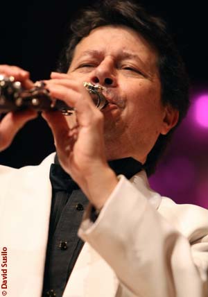 John MacLeod and Bob DeAngelis in white tuxedos, in contrast to the orchestra musicians who are dressed in black, take to the stage and are greeted with a polite, yet enthusiastic response from the audience. MacLeod steps up upon his conductors podium and places his cornet on the floor next to him. As he stands, he raises his conductors baton and Lets Dance fills the concert hall. A full luscious sound cascades from the stage with a swinging rhythmic beat, and on top, the clean, clear and crisp clarinet sound of Bob DeAngelis rings true in fine tribute to Benny Goodman. As John MacLeod would state later in the performance, Bob DeAngelis is a world class clarinettist.