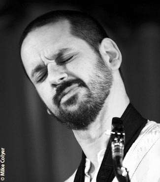Duggans marimba introduced Waiku, with Downing next to join the fray followed by a short sax blast, before a coda to the intro marimba beat. Hetherington entered with some feathery drums, and then Padron took over for with a blistering sax solo that again revealed out his formidable mid- and low-range tones. Appropriately, given its name, which means people of the moon, the song returned to a tropical trance, almost dub-like groove, with Lerners keyboard subtly climbing the ladder.
