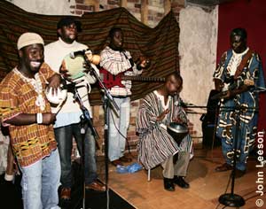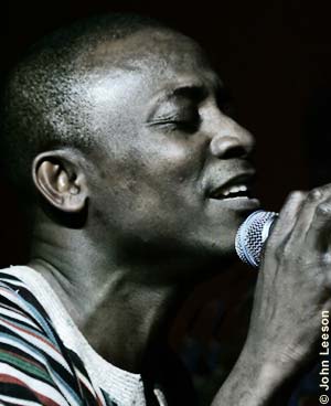 Naturally, however, to the majority of the audience, the words merely enhanced the fantastic music being delivered by the classy, blue-dashiki clad elder statesman of the stage, guitarist Pa Joe; percussions by the dynamic Kofi Ackah (on a Senegalese Talking Drum, a small congo-like instrument which is alternately beaten with one field-hockey-stick-shaped drumstick, and five rhythmic fingers) and Frederick Osagie on Ukus (a large, stomach-shaped Nigerian maraca); all driven by electric bassist Ebenezer Agyekum and topped off with the classic voice of Theo Boakye.