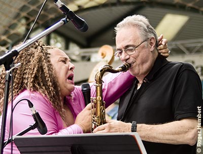 The audience loved her. Singing out a yeah she leaned back and held out the mike for them, please somebody scream! Audaciously, she walked over to Pat LaBarbera, rubbed the top of his head and slithered down to his knees, singing Save your love for me. He may well have been suppressing a laugh, but you would never have known it in his playing. How does one manage that? It was a great moment. Well before the end of Liberty Silvers performance everyone was on their feet. |