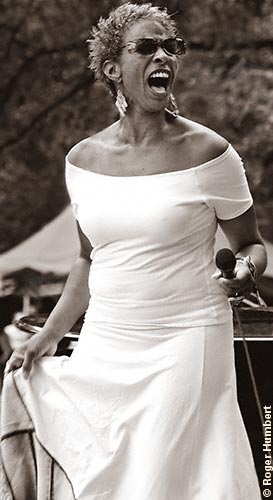 June Garber came out on stage, a bold, brash presence. Originally from South Africa, she has worked in Las Vegas and Atlantic City but is fairly new to Toronto. Ill start off cheery, she said with a South African accent, and Ill depress you later. Expertly, she smiled her way through a bouncy Im Beginning to See the Light (light with a clearly articulated final t). There was a huge crowd in front of the bandstand by now and the grey heavy air threatened rain. June Garber sat on a black stool borrowed from the Perrier stand, and started to sing Black Coffee. Sultry, more brooding than the sky, she took her time. The pacing, the spacing and the intensity were delicious.