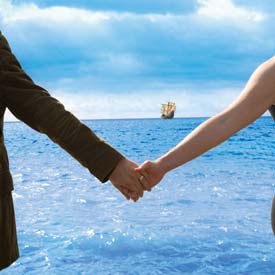In the current Toronto production, the stark, conceptual stage design is mood-invoking and intriguing, as is the accompanying lighting design, both by Beth Kates. Projections Designer Ben Chaisson has created magical oceanic effects against the unyielding brick back wall of the performance space, while a small wooden ship is suspended in rear center stage, creating an unsettling and surrealistic element within the fog-laden mise en scene.