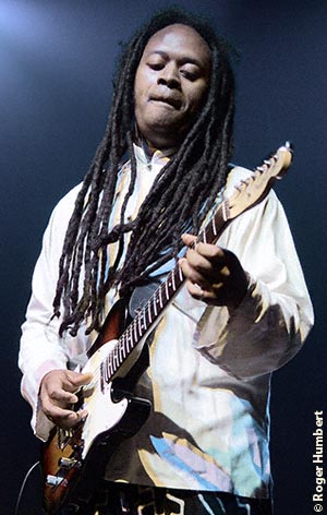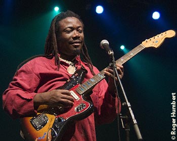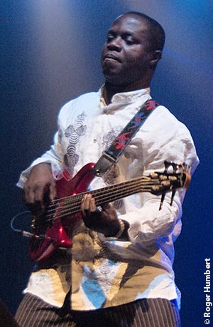 Adam kept the energy going with one of his up-tempo Kenyan grooves, playing from his knees, flat on his back, and behind his head without missing a beat while Pa Joes Afrobeat-gospel vibes led the rhythm guitars. By now the band was at its absolute apex, continuing into one of Donnés songs from his recent album Rhythm was Born. Until then the most reserved of the four guitarists through the show, Donné unleashed a mindbending five-minute volley in which one could simultaneously hear his African roots, European world/club sensibilities and North American blues-rock in the spirit of Hendrix. This personal high point of the show was a coda added to the beginning of the songs melody, the vocals moving from rangy harmonies to a hiphop-style scat.