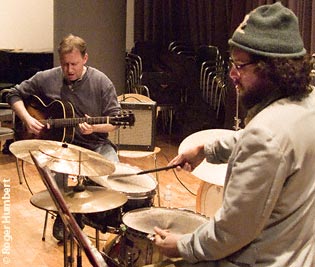 Aldcroft was in fact quite mild-mannered on guitar, as compared to his always-smiling, always goofing-off buddy Clark, who used just about everything at his disposal to put a rhythm in motion. An old pair of tap-dancing shoes, pennies on the skin of his snare, scrapes of the cymbals and tactful caresses with the mallets it was all fair game. There was an obvious Han Bennink goofiness to Clarks on-going circus act, but this was actually a good thing, as rarely did he go completely over the top.