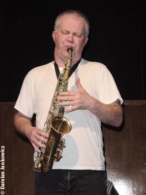 Feeling deadly sick that night, Frode Gjerstad lost his voice and could barely speak. In between numbers, he pleaded for a glass of water, and his wish was swiftly fulfilled. Its rather surprising that for a sick man, he was able to pound such a large punch into his alto. How is it possible that during the 70 minute set, not once did he run out of breath? How is it possible he didnt whine and complain and cancel the show altogether? Truth is Gjerstad is a determined soul. Once he set his mind on something, theres no stopping him.