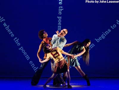 It was great fun to cheer on Jennifer Dahl who danced and sang "Pome" with full-on physicality and a strong finish; and then get bowled over by Andrea Nann's equally creative, high-stepping interpretation of the same words. In "Score for Tony: First Movement", the fourth dancer Graham McKelvie brought us to the same place with his outstretched arms. His performance of the text and his entertaining body language were in perfect synch.
