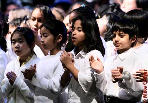 After a 15 minute intermission, the band took to the stage for the last act. A blues based tune began, AY-ba-da-ba-Wee-boo. The children were ushered back onto the stage, they were at their rhythmic best, scatting away like old pros. Larry Cramer on trumpet soloed over the voices, the adult choir and the childrens choir harmonized, the band played the perfect accompaniment, Don Thompson and Dr. Harris took turns trading lyrical fills in wondrous harmony.
