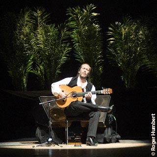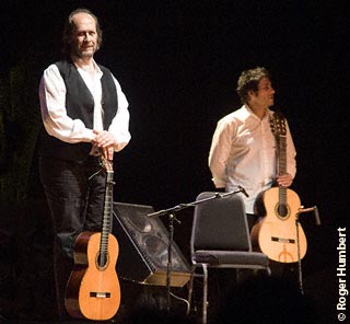 The program listed not song titles, but nine different flamenco forms or styles, out of the many that exist, leaving lots of room for the expression and manifestation of the soul (duende once again). The cajon and djembe set the second piece in motion, two singers entered, clapping, Paco played and the womens voices, their cries of exorcism wrenched our souls. The third piece was a Buleria, a high-spirited piece prompting lots of improvisation, lots of communication between the two percussionists and Paco de Lucia, and culminating in laughter and the patting of backs. Alone once more on stage, Paco de Lucia played a beautiful Minera. In the first half of the show, the full sextet was on stage only for the final piece, an Alegria with 12/8 rhythm and complex palmas or hand-clapping precisely performed by keyboard player, Antonio Serrano, bass player, Alain Perez, second guitarist, Nino Josele and the two vocalists, Chonchi Heredia and Montserrat Cortes while Israel Suarez Pirana played cajon and Paco de Lucia played guitar. Towards the end of the piece, Serrano took up his electric bass and Perez his guitar, giving us a taste of things to come in the second half of the show.