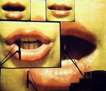 In the second, and amusing, 16-point grid projection, a pair of moving lipstick-red lips are speaking vowels? consonants? diphthongs? mere gibberish? in what language? on what occasion? As the multi-tiered lips lose detail, then overlap and evolve at one moment into a textured, folkish quilt, and then at another moment stand still as a stark colour field painting, static electronic sounds, howling voices, and a drone, become more pronounced.