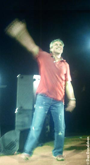 That sweetness, at least that melodic sweetness continued with O Homen Velho (The Old Man), whose Portuguese lyrics both hid and shielded the English speakers in the audience from its bitter sweetness, while Veloso's voice, slightly darker, lower than in Um Tom sang: "Ele jà tem a alma saturada de poesia, soul e rock'n'roll/As coisas migram e ele serve de farol" (His soul is already saturated with poetry, soul and rock'n'roll/he acts as the lighthouse as things move on), and later: "A brisa leve traz o olor fulgaz/Do sexo das meninas" (The breeze carries back to him the sweet smell/of the young womens sex). Somewhere in this poignancy, there's something that verges on creepy, but not in the delivery of Caetano. Forever the ambiguous androgyne, forever the Dionysus, someone who has forever taken the underlying sexuality of the singer and the song as part of the package, sometimes cynically, when considering the mythic 'tropical' allure of Brazil, sometimes as an ode, now as a eulogy. Veloso seemed to be resigned to what happens, but also unleashing an anger an anger that could not have been clearer in the next song, "Homen".