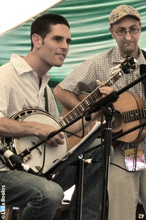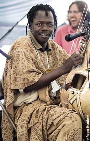 In the Upper Wyndham Street Tent, the first performer of the day, Jah Youssouf, ngoni player extraordinaire, began with an intricately played solo. He was later joined by: Dave Clark, drums; Colin Fisher (AIM orchestra member), sax; Michael Herring, bass; Jason Kenemy, rhodes, steel pan, accordion, percussion; Lewis Melville, guitar; and Jayme Stone, banjo. A number of these players are avid participants in the Woodchopper's Association (*see note at bottom).