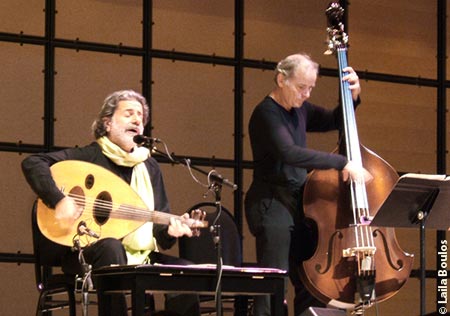 The musical template of swift melodies gliding into meditative solos which then effortlessly became spinning musical dust storms, flowed as sheiks' veils across the stage throughout the performance. Each musician was a true virtuoso in his own right from Marcel Khalifé pulling the strings of his oud so they would reverberate just so; to Peter Herbert alternating between using a bow and fingers to squeeze diamonds of sound from the strings; to Bachar Khalifé with his flying fingers Charlestoning between his bench and derbakeh; or, to Rami Khalifé who would alternately reach in to pull the strings of the piano or channel the speed of sound into the fingers of one hand flying across the keys while holding steadfastly onto a few keys with the fingers of the other.