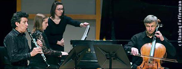 Hungarian Impressions for clarinet, cello and piano received its world premier this afternoon with Amicis Joaquin Valdepenas and David Hetherington (clarinet and cello) and guest pianist Orli Shaham. The piece consists of a series of small portraits of that musical culture which Safavi was able to absorb, during his brief study of the modes of Hungarian and Gypsy music. My impression was of strongly melodic lines alternating between wistful sadness and dance to a wild climax, recalling through the clarinet a sound familiar from klezmer music, with a nice innovation of having Hetherington drum with his fingers on the body of the cello.