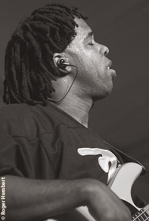 Everyone in this band had ridiculous chops. Guitarist Regi Wooten, Victors older brother and first bass teacher, showed off his prowess in a guitar feature that built up to such a fit that he grabbed his microphone and started using it as a slide. Their tour manager rushed out onstage and grappled with the manic musician to save the microphone. Regi continued to lunge back and forth, putting his guitar under his leg and shredding like he was possessed. Just when I thought he couldnt do any more, the lights went down and the tuning pegs and inlays on his fretboard lit up with blue LEDs.