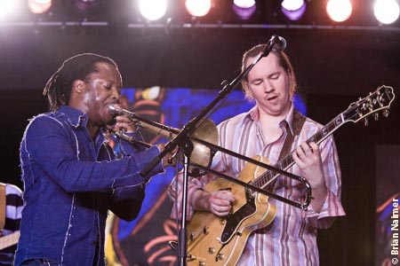 The group chosen to close off the evening the Dennis Rollins' Badbone & Co. proved to be an amiable, funky butt (jazz) group, represented in large part by its leader and lead celebrant, Dennis Rollins, on warm-toned trombone. The amiable Rollins loves songs, has a pop and dance sensibility, and he knows about the electronic shimmers of Miles Davis' "In A Silent Way". |