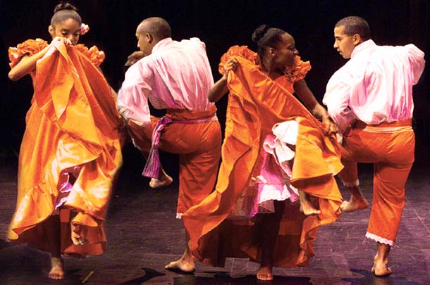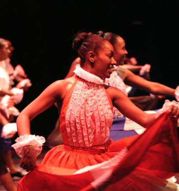 The dance of Baile de Mulatas showcased the abilities of the skillful guitarists, and the festejo song El Que no Tiene de Inga Tiende de Mandinga spoke of the rhythm of here, and of then. "Este ritmo de negro, Este ritmo sabroso"; the movements of the ritual dance Festejo Ritmo reflected strength and grace, starting with humble beginnings and with the bare feet of the dancers, marching to a powerful end ¡eso! (that it is!). Jumping foot to foot, a shake of the shoulders and a spin, they danced separately then paired together, shaking and swirling with energy unbounded. Ending in a fury of the women in long red dresses with bright red flowers in their hair and the men in red pants with white tops, we are left breathless from their spirited and energetic exuberance, needing the intermission.