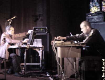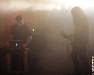 As the smoke filled the church, that question ceased to matter. In the darkened, smoke-filled church the spotlights were propped high, obscuring the two musicians buried somewhere in the mist. (There was so much smoke in the church; all that was visible were the outlines of the two musicians along with the logo on Rehbers Mac.) OMalley began the proceedings with a bluesy guitar riff that promised an enjoyable enough mass. Just then Pita began to work his magic. As he processed OMalleys guitar riff, OMalley in turn began to play faster, spinning circles of riffs on top of the original one. At times, he would turn towards the amps to allow feedback to do its part. As the massive amounts of feedback flowed from the speakers, Rehberg concocted a mix of skewed, jittery beats that were juicy on the bass end of the spectrum. These would come in spurts and would later be replaced by thickly steaming high-pitched heaps of electronic madness.