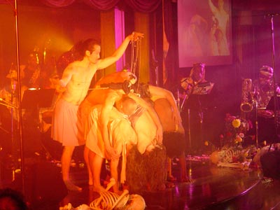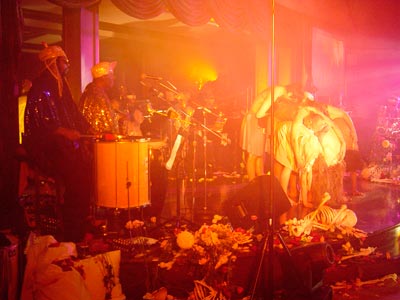 The most difficult of all sections to grasp was the finale. Entitled Attunement, its over-riding characteristic was a slew of the most complex routines the dancers would perform that night. Noogenesis saw Bill Coleman cavort with a skeleton. As if to show human reliance on technology and science to make eternal improvements to our bodies, he tap-danced across the stage like some sort of a mummy that merely moments ago he was so tenderly caressing. The choreography (all put together by Bill Coleman in collaboration with the dancers of the troupe) was flawless. The bodies writhed in pain. They were ancient and they were renewed. Each one danced in quick succession alone or with a variety of partners. The Deployment of the Noosphere featured Carol Prieur and Bill Coleman standing hypnotized being dressed and undressed by various members of the troupe, while a couple of them were throwing flower petals generously all over their bodies. The shows closer was the most jubilant piece of the night. In fact, in the spirit of Arkestras audience involvement, World in Involution was dance along that involved many of the audience who wanted to join in the fun. Cavorting wildly around the stage, audience, dancers and many members of the Arkestra trotted around playing, dancing and singing without a care in the world. We Travel The Spaceways was heard being repeated ad infinatum, while wide-grinned smiles didnt leave anyone present for a minute. |