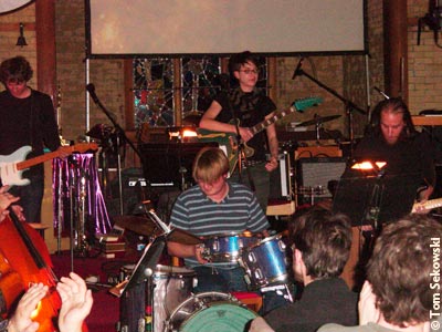 Resident of Toronto, guitarist Aidan Baker is someone whose work Ive admired over the last few years. Equally as good in constructing drone landscapes as he is within the realms of his harsher outfit Nadja, his music is a difficult one to slap a label on. Tonight was the night we were all witnesses to the premiere of his Liminoid outfit. Made up of the leader on guitars (and some vocals), Liminoid also features guitarists Clara Engel and Jonathan Demers, cellists Nick Storring and Tilman Lewis, violinist Laura Bates along with percussionists Richard Baker and Jakob Thiesen (who also dabbled in electronics). |