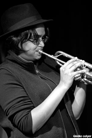 Rampersaud's trumpet and cornet vocabulary was impressive and thoroughly engaging; multiphonics, rips, and flutters, on impulse, would turn inward into a propulsive breath line of expressive mutters, wheezes, and squeaks, that matched the tone and spirit of Kyle Brenders' pressing soprano and the embracing all-over sound curtains of his tenor. Brenders was the unobtrusive conductor in a set that was, finally, the product of the two players' respectful and fluent creativity.