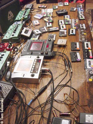 As with all good things in life, sometimes one has to feel a vibe before a concrete gelling process takes place. Before one can be called a great swimmer, years of practice have to precede the medal ceremonies. The first bit of the concert was just that a gelling process. During much of the first hour (in which only Onda and Licht took part), the duo tested the waters. They were swimming but at times sounds fell through the cracks. Much of the time, I heard a progression to something greater, but before a build-up was allowed to proceed to a higher plateau, things crumbled from a sonic perspective. Licht was merely teasing the audiences ears with subtle string caresses. When he did get off the ground and actually increased the intensity by hitting the pedals, the bursts were short-lived. All the while, Onda was trying to react and lead the duo something that I imagine was quite difficult to achieve. He would load random tapes into his Walkmans and then distort the sound according to his whim. Sure, he would consider what his musical partner was doing at the time, but more often than not, he was faced with miscued tapes. One got the feeling he was flustered too often, which resulted in a lackluster set of music. What should have worked came off as a rehearsal and a testing of the waters for the trio set that came after a short break.