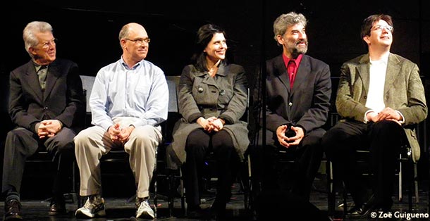 Aitken, the Artistic Director of New Music Concerts, began the talk by reminiscing about his long-time friendship with Reynolds, setting the mood for what would later become a full throttle, feel-good flattery session. The illumination began with Reynolds posing specific, intellectual questions to his four protégés. Their answers were verbose, esoteric, and made me quickly forget the question, but this is what I gathered from each of them. David Felder, a professor of composition at the University at Buffalo, declared that the space in which his work is performed is part of the composition itself. From Cuenca, Ecuador, Juan Campoverde Q. described his struggle for identity as an American immigrant and his fascination with the pre-Columbian era. Israeli-born Chaya Czernowin started her spiel with a loud, somewhat awkward cackle, and then basically said that she loves to mystify her audience with her metaphoric music. Finally, the gleefully passionate Brazilian Antonio Carlos Borges-Cunha described his rural upbringing and how the violence of a storm or of survival in general, stimulated his musical creativity. He used one hand to hold the microphone and the other to gesticulate, ending his blurb with I need PEACE, BEAUTY and SILENCE!
