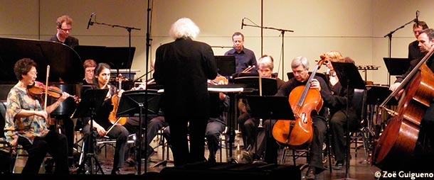 I needed an intermission then and there, but Chaya Czernowins piece was next. Written in 2003, Winter Songs II: Stones is one version of a piece meant to explore the idea of, in the composers words, being pulled into the cave of ones interior. All I can say about it is the cymbals sounded like a rusty, creaky weathervane on top of a barn that is being encroached upon by murderous boars that take over the farm and establish a musical torture chamber in the paddock. At the same time I could see with my actual eyeballs that the viola, cello and bass were bowing the waist of their instrument, the percussionist was shaking a recycling bin and the flautist was huffing into a bass flute without producing any pitch. All the while, the wonderful white hair and purple shirt were leading the animals into battle.